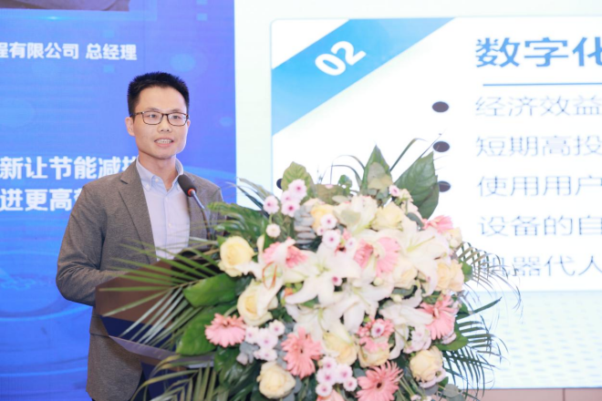 圖為山東睿航環境工程有限公司總經理陳海峰做《商業模式創新讓節能減排與數字化推進更高效》主題報告