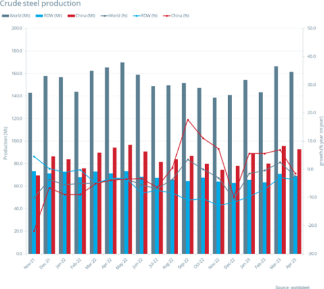 2023年4月全球63個納入世界鋼鐵協會統計的國家和地區的粗鋼產量為1.614億噸,同比下降2.4%。