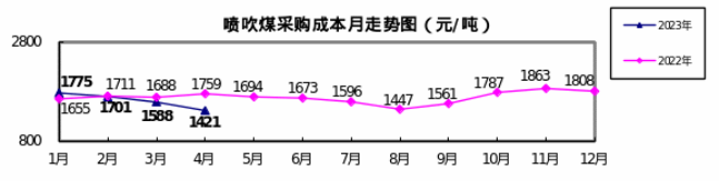 噴吹煤4月份加權(quán)平均折算成干基的采購成本為1420.54元/噸,環(huán)比下降167.40元/噸,降幅為10.54%。1—4月累計平均折算成干基的采購成本為1619.26元/噸,同比下降73.41元/噸,降幅為4.34%。