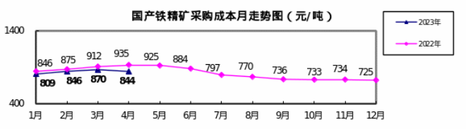 國產(chǎn)鐵精礦(干基)4月份加權(quán)平均采購成本為843.87元/噸,環(huán)比下降26.01元/噸,降幅為2.99%。1—4月累計平均采購成本為844.41元/噸,同比下降39.33元/噸,降幅為4.45%。