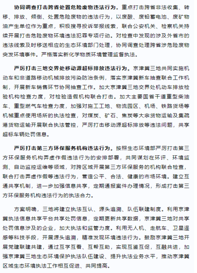 為深化京津冀生態環境執法聯動工作機制,保障區域環境安全,推進區域生態環境質量穩定改善,近日,京津冀生態環境執法聯動工作領導小組制定了《2023-2024年京津冀生態環境聯合聯動執法工作方案》,對2023年6月至2024年5月期間京津冀生態環境執法重點工作進行安排部署,明確將重點圍繞大氣、水、固體廢物、移動源、打擊第三方環保服務機構違法五個方面開展聯動執法。