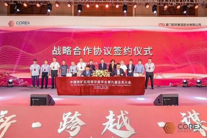 會(huì)議期間,北鐵中心與廈門國貿(mào)集團(tuán)股份有限公司舉辦戰(zhàn)略合作協(xié)議簽約儀式。本次合作是北鐵中心開拓“大客戶專場”業(yè)務(wù)模式的重要舉措,雙方將通過平臺(tái)專門板塊開展全方位合作。游松和李鵬代表雙方簽署協(xié)議。王穎生、錢景汾、中國礦產(chǎn)資源集團(tuán)鐵礦事業(yè)部資源平衡總監(jiān)劉政群等共同見證簽約。