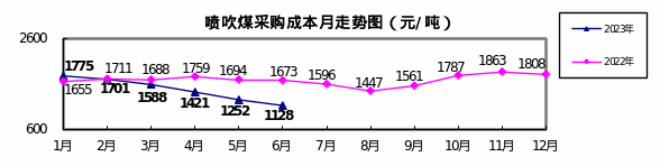 噴吹煤6月份加權平均折算成干基的采購成本為1128.38元/噸,環比下降123.89元/噸,降幅為9.89%。1-6月累計平均折算成干基的采購成本為1469.01元/噸,同比下降204.13元/噸,降幅為12.20%。