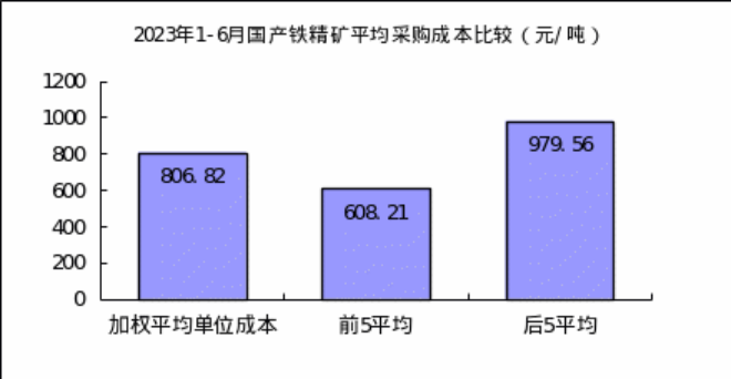 1-6月對標企業國產鐵精礦折算成62%品位的平均采購成本為806.82元/噸,成本最低的前5家企業的加權平均采購成本為608.21元/噸,比對標企業平均采購成本低198.61元/噸,低于平均采購成本24.62%;而采購成本最高的5家企業的加權平均采購成本為979.56元/噸,比對標企業平均采購成本高172.74元/噸,高于平均采購成本21.41%。