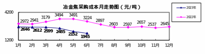 冶金焦6月份加權平均折算成干基的采購成本1945.28元/噸,環比下降207.01元/噸,降幅為9.62%。1-6月累計平均折算成干基的采購成本為2407.13元/噸,同比下降805.23元/噸,降幅為25.07%。