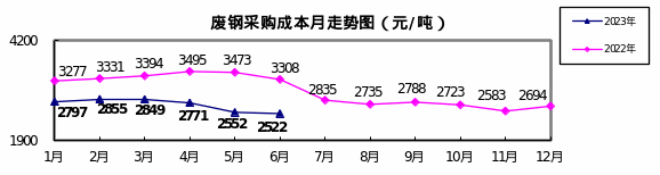 廢鋼6月份加權平均采購成本為2521.97元/噸,環比下降30.04元/噸,降幅為1.18%。1-6月累計平均采購成本為2718.52元/噸,同比下降664.97元/噸,降幅為19.65%。