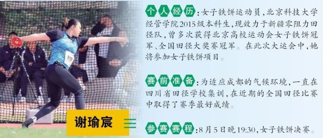 在此次成都大運(yùn)會上,畢業(yè)于北科大的2名運(yùn)動健兒將參加田徑項(xiàng)目角逐。他們曾在全國大學(xué)生田徑賽場上取得優(yōu)異成績,也曾在首都高校運(yùn)動會上打破塵封20余年的賽會紀(jì)錄。他們的名字是:謝瑜宸、張悅。