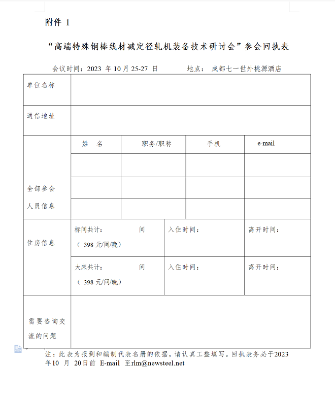 1、為準確落實參會人員數量,安排好代表的食宿及參觀,請參加會議的代表務必于2023年10月20日前將“回執表”發至會議秘書處,E-mail:rlm@newsteel.net