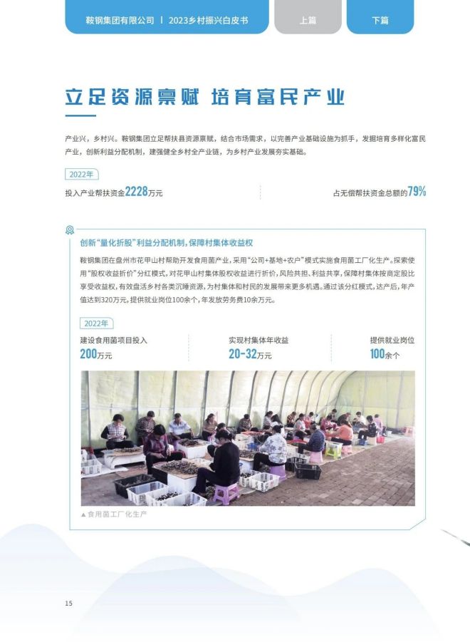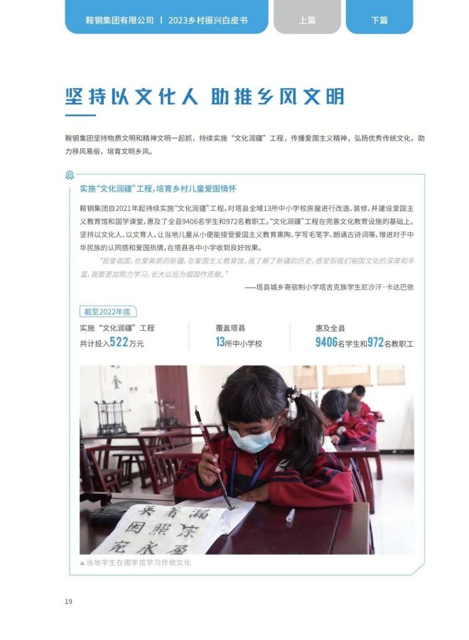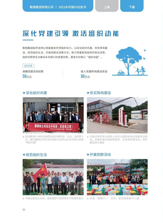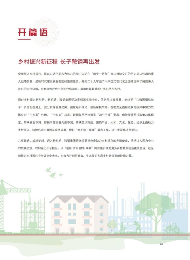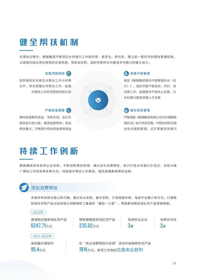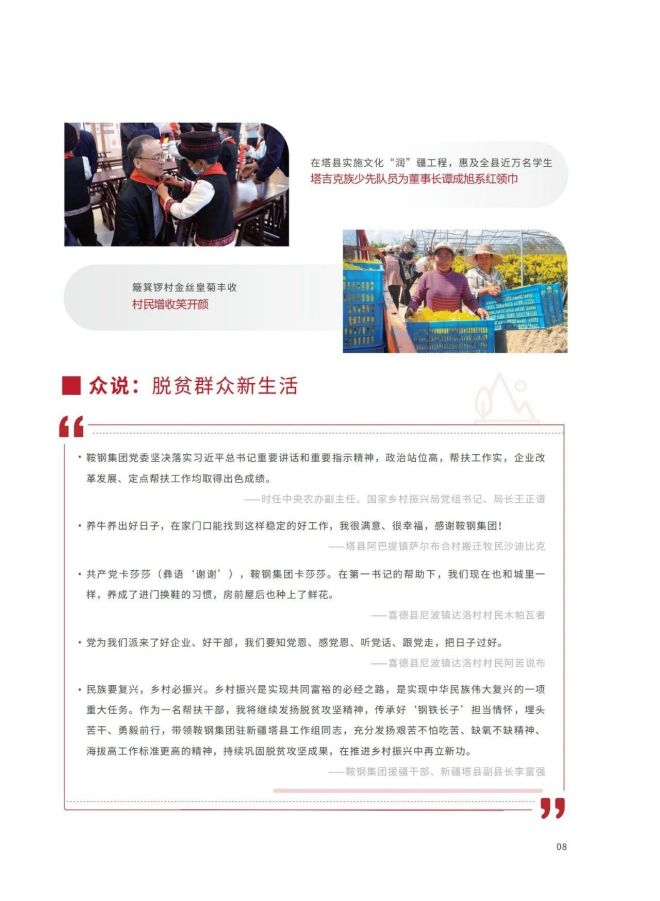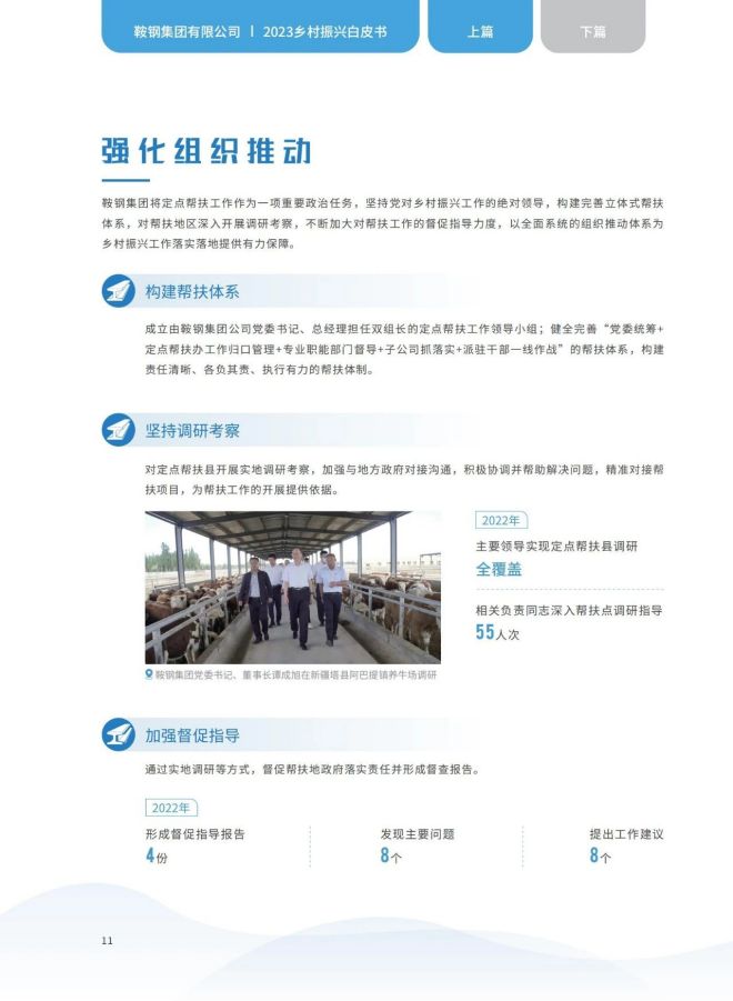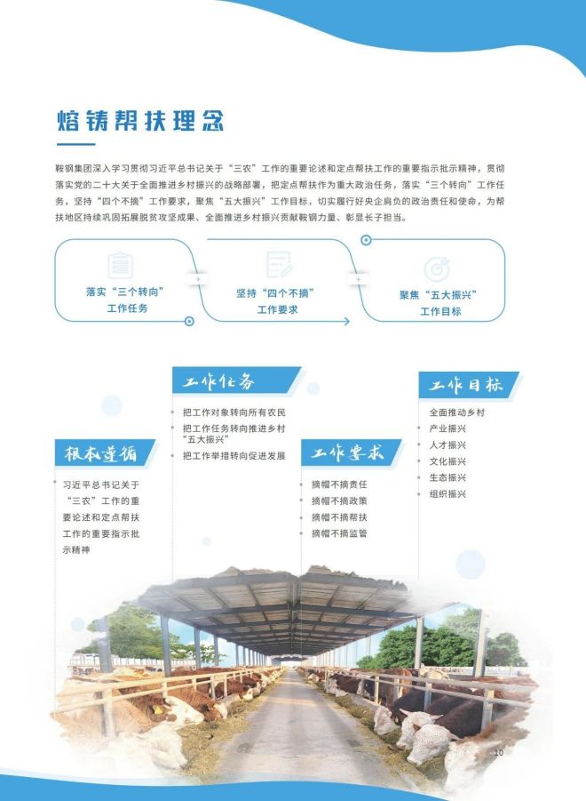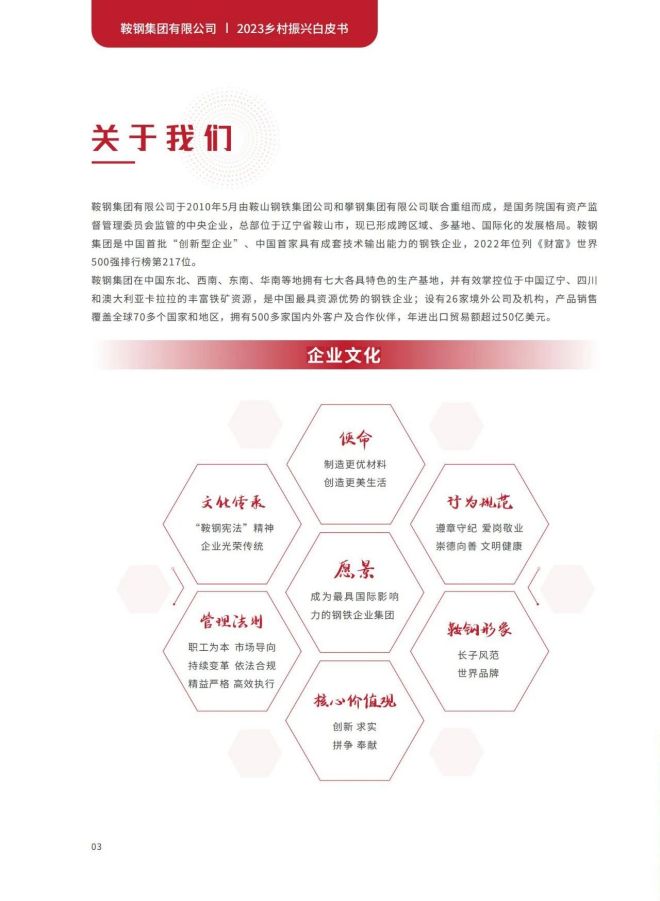 近日,《2023鞍鋼集團有限公司鄉村振興白皮書》發布,聚焦鞍鋼集團嚴格落實“四個不摘”要求,保持接續幫扶政策總體穩定、幫扶資金不減、幫扶干部派駐力度不減、幫扶重點突出,圍繞產業、人才、文化、生態、組織全面助力鄉村振興,持續鞏固拓展脫貧攻堅成果,做好“兩不愁三保障”重點工作,進一步深化消費幫扶。白皮書以數說、圖說、眾說的等方式生動形象地展現了鞍鋼集團幫扶工作取得的突出成績。讓我們一起翻開白皮書,了解鞍鋼集團助力鄉村振興工作成效——