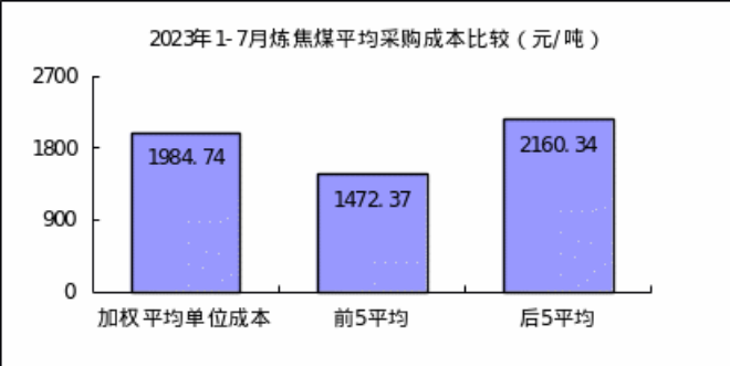 1—7月對標(biāo)企業(yè)冶金焦平均采購成本最低的前5家企業(yè)的加權(quán)平均采購成本為1956.46元/噸,比對標(biāo)企業(yè)平均采購成本低379.83元/噸,低于平均采購成本16.26%;而采購成本最高的5家企業(yè)的加權(quán)平均采購成本為2732.33元/噸,比對標(biāo)企業(yè)平均采購成本高396.04元/噸,高于平均采購成本16.95%。