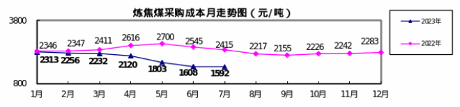 對標(biāo)企業(yè)煉焦煤7月份加權(quán)平均折算成干基的采購成本為1592.43元/噸,環(huán)比下降15.62元/噸,降幅為0.97%。1—7月累計(jì)平均折算成干基的采購成本為1984.74元/噸,同比下降496.85元/噸,降幅為20.02%。
