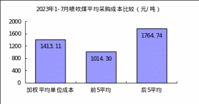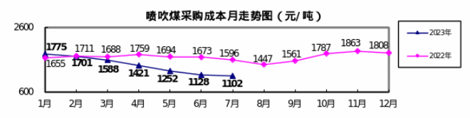 噴吹煤7月份加權(quán)平均折算成干基的采購成本為1102.14元/噸,環(huán)比下降26.25元/噸,降幅為2.33%。1—7月累計(jì)平均折算成干基的采購成本為1413.11元/噸,同比下降248.44元/噸,降幅為14.95%。