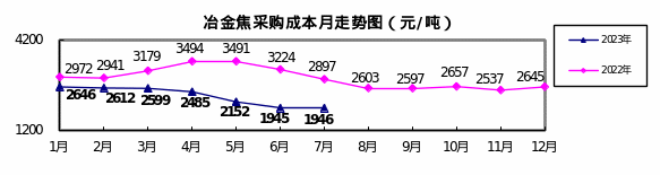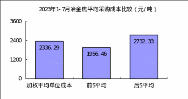 冶金焦7月份加權(quán)平均折算成干基的采購成本1945.79元/噸,環(huán)比升高0.52元/噸,升幅為0.03%。1—7月累計(jì)平均折算成干基的采購成本為2336.29元/噸,同比下降828.22元/噸,降幅為26.17%。