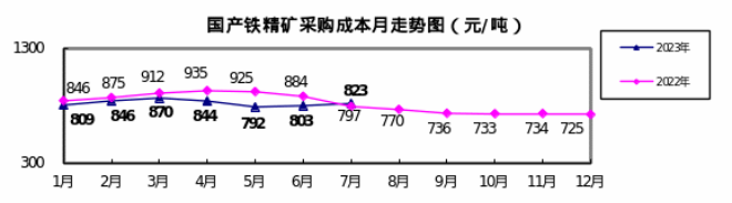 國產(chǎn)鐵精礦(干基)7月份加權(quán)平均采購成本為822.73元/噸,環(huán)比升高19.97元/噸,升幅為2.49%。1—7月累計(jì)平均采購成本為828.02元/噸,同比下降52.55元/噸,降幅為5.97%。