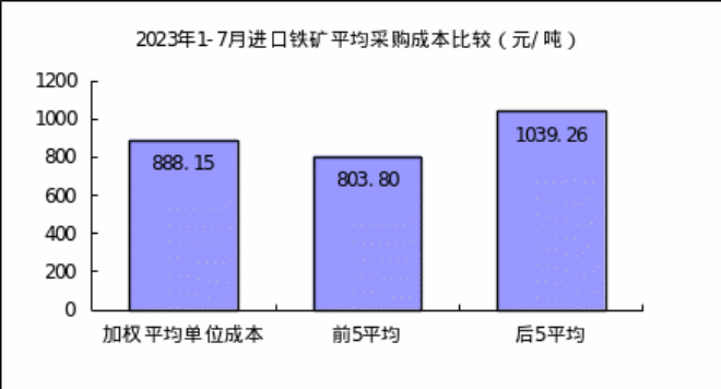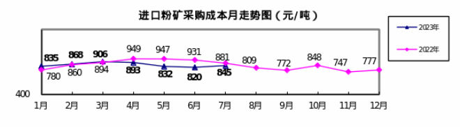 進(jìn)口粉礦7月份加權(quán)平均采購成本845.42元/噸,環(huán)比升高25.70元/噸,升幅為3.13%。1—7月累計(jì)平均采購成本為857.27元/噸,同比下降32.98元/噸,降幅為3.70%。