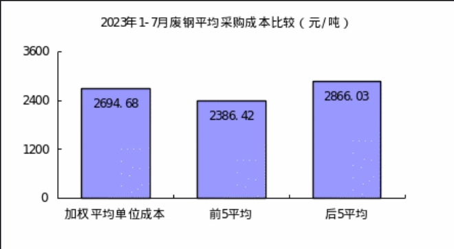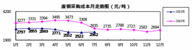 廢鋼7月份加權(quán)平均采購成本為2562.49元/噸,環(huán)比升高40.34元/噸,升幅為1.60%。1—7月累計(jì)平均采購成本為2694.68元/噸,同比下降635.07元/噸,降幅為19.07%。