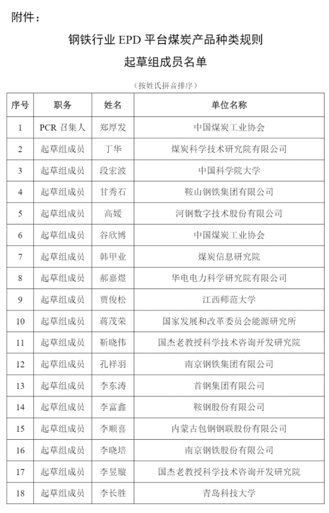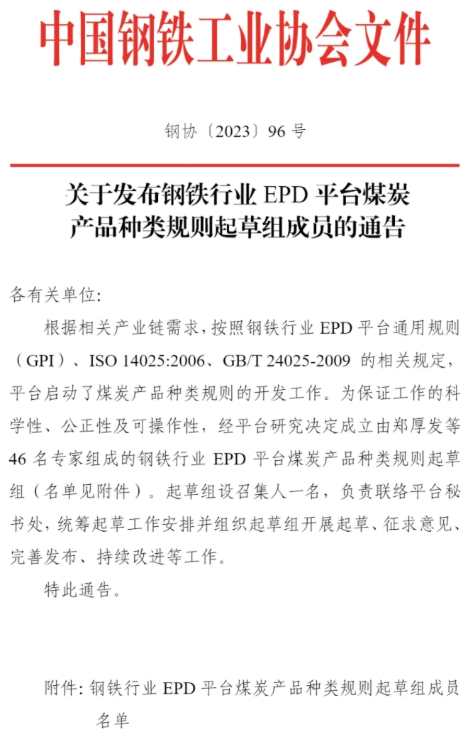 關于發布鋼鐵行業EPD平臺煤炭產品種類規則起草組成員的通告