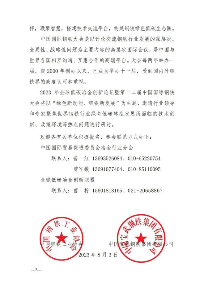 關(guān)于召開 2023 年全球低碳冶金創(chuàng)新論壇暨第十二屆中國國際鋼鐵大會的通知