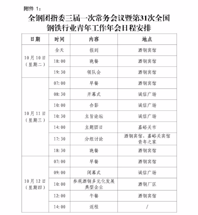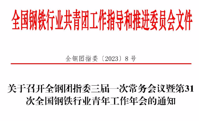 經全國鋼鐵行業共青團工作指導和推進委員會(以下簡稱 “全鋼團指委”)研究,并報請共青團中央和中國鋼鐵工業協會同意,全鋼團指委三屆一次常務會議暨第31次全國鋼鐵行業青年工作年會(以下簡稱“會議”)定于10月在酒泉鋼鐵(集團)有限責任公司召開。現將有關事宜通知如下: