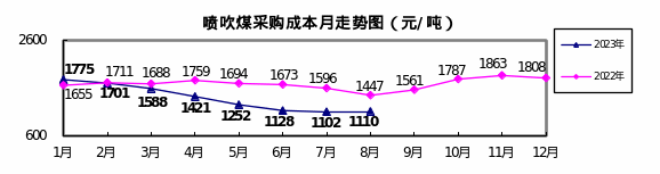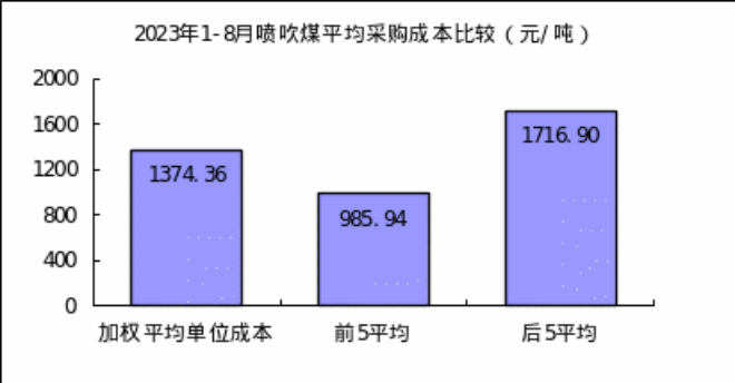 噴吹煤8月份加權平均折算成干基的采購成本為1109.75元/噸,環比升高7.61元/噸,升幅為0.69%。1—8月累計平均折算成干基的采購成本為1374.36元/噸,同比下降264.28元/噸,降幅為16.13%。