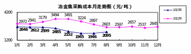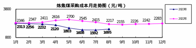2023年8月,除動力煤外,其他品種采購成本環比以上升為主,焦煤、冶金焦升幅較大。