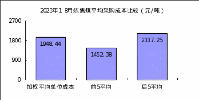 1—8月對標企業冶金焦平均采購成本最低的前5家企業的加權平均采購成本為1937.07元/噸,比對標企業平均采購成本低367.17元/噸,低于平均采購成本15.93%;而采購成本最高的5家企業的加權平均采購成本為2665.13元/噸,比對標企業平均采購成本高360.89元/噸,高于平均采購成本15.66%。