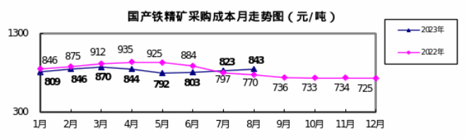 國產鐵精礦(干基)8月份加權平均采購成本為842.98元/噸,環比升高20.25元/噸,升幅為2.46%。1—8月累計平均采購成本為831.95元/噸,同比下降44.64元/噸,降幅為5.09%。