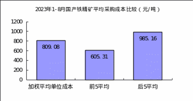 1—8月對標企業國產鐵精礦折算成62%品位的平均采購成本為809.08元/噸,成本最低的前5家企業的加權平均采購成本為605.31元/噸,比對標企業平均采購成本低203.78元/噸,低于平均采購成本25.19%;而采購成本最高的5家企業的加權平均采購成本為985.16元/噸,比對標企業平均采購成本高176.08元/噸,高于平均采購成本21.76%。