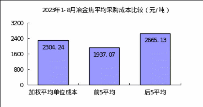冶金焦8月份加權平均折算成干基的采購成本2094.75元/噸,環比升高148.96元/噸,升幅為7.66%。1—8月累計平均折算成干基的采購成本為2304.24元/噸,同比下降800.65元/噸,降幅為25.79%。