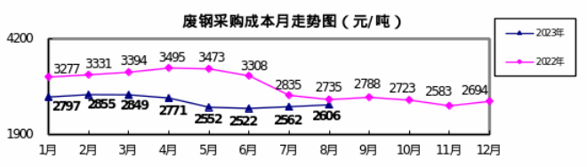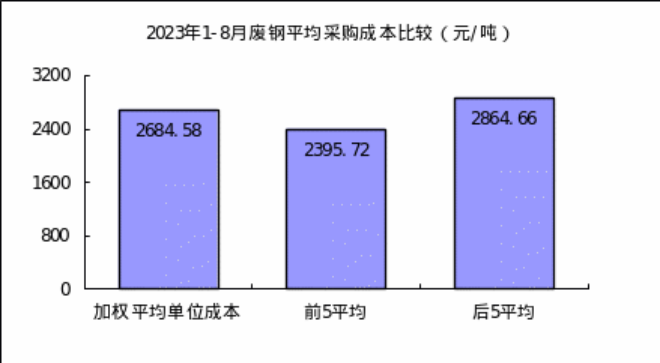 廢鋼8月份加權平均采購成本為2606.20元/噸,環比升高43.71元/噸,升幅為1.71%。1—8月累計平均采購成本為2684.58元/噸,同比下降596.84元/噸,降幅為18.19%。