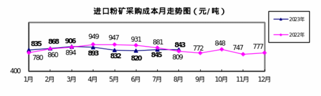 2023年1—8月,煉焦煤采購成本同比下降20.31%;冶金焦同比下降25.79%;國產鐵精礦同比下降5.09%,進口粉礦同比下降2.42%;廢鋼同比下降18.19%。