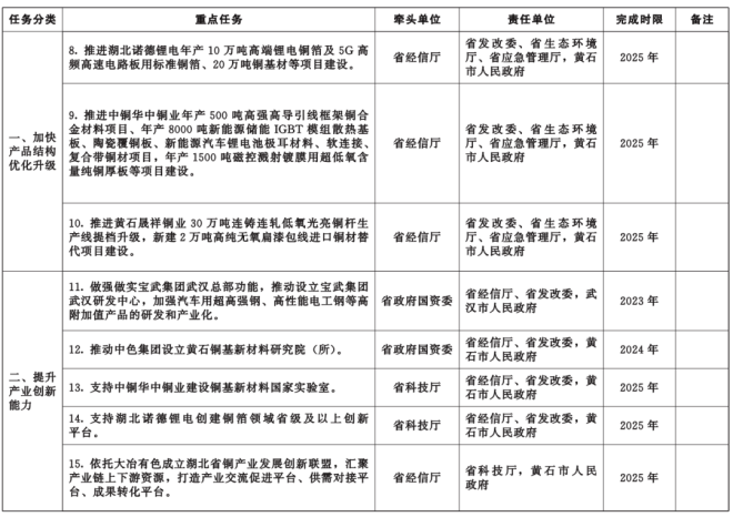 6.延伸銅基高端材料產(chǎn)業(yè)鏈。依托華中銅業(yè)重點(diǎn)發(fā)展汽車用高精銅板帶箔、低氧銅桿等銅基高端材料,向汽車電子連接器、汽車線束、新能源汽車充電樁等相關(guān)產(chǎn)業(yè)延伸,逐步覆蓋特高壓電纜、航空航天電纜、軌道交通電纜等智能制造產(chǎn)業(yè)領(lǐng)域,建設(shè)高強(qiáng)高導(dǎo)引線框架銅合金材料、新能源儲能IGBT模組散熱基板、新能源汽車鋰電池用銅基材、磁控濺射鍍膜用超低氧含量純銅厚板等項(xiàng)目,實(shí)現(xiàn)進(jìn)口替代。推動(dòng)湖北諾德鋰電10萬噸高端鋰電銅箔和湖北中一科技4萬噸高性能銅箔項(xiàng)目加快建設(shè),建成全國最大電子銅箔生產(chǎn)基地。支持晟祥銅業(yè)30萬噸低氧光亮銅桿生產(chǎn)線和正威襄陽新材料25萬噸低氧光亮銅桿生產(chǎn)線全面達(dá)產(chǎn)達(dá)效,建成華中地區(qū)最大的銅桿生產(chǎn)基地。