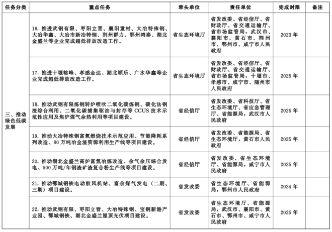 13.實(shí)施鋼鐵行業(yè)超低排放改造。2023年底前,推進(jìn)武漢、襄陽、黃石、荊州、鄂州、咸寧等地鋼鐵企業(yè)完成超低排放改造,2025年底前全省鋼鐵企業(yè)完成超低排放改造。