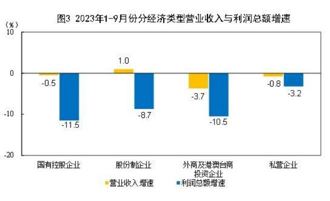 1—9月份,規(guī)模以上工業(yè)企業(yè)中,國(guó)有控股企業(yè)實(shí)現(xiàn)利潤(rùn)總額18477.0億元,同比下降11.5%;股份制企業(yè)實(shí)現(xiàn)利潤(rùn)總額39623.7億元,下降8.7%;外商及港澳臺(tái)商投資企業(yè)實(shí)現(xiàn)利潤(rùn)總額12878.1億元,下降10.5%;私營(yíng)企業(yè)實(shí)現(xiàn)利潤(rùn)總額14385.0億元,下降3.2%。