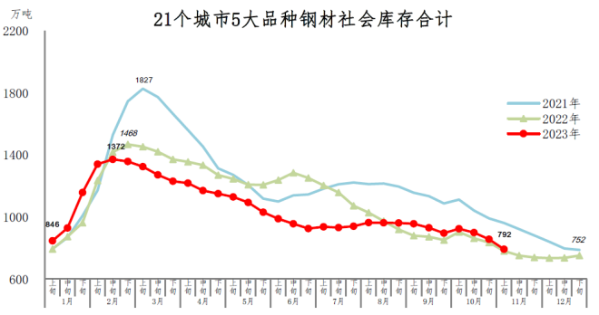 11月上旬,21個城市5大品種鋼材社會庫存792萬噸,環比減少65萬噸,下降7.6%,庫存延續下降態勢,降幅繼續擴大;比年初增加40萬噸,上升5.3%;比上年同期增加11萬噸,上升1.4%。