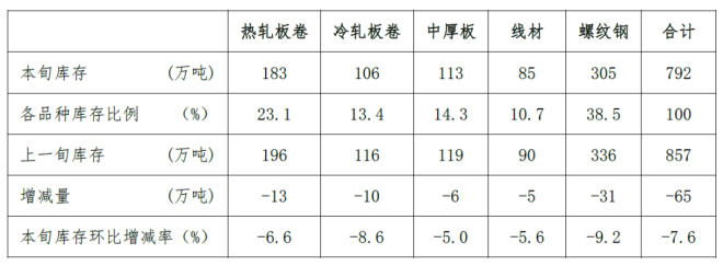 11月上旬,5大品種鋼材社會庫存環比全部下降,其中螺紋鋼仍為減量和降幅最大品種,具體見下表。