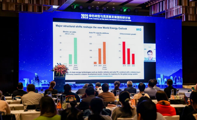 國(guó)際能源署能源分析師揚(yáng)尼克·蒙肖爾介紹了國(guó)際能源署關(guān)于全球能源清潔轉(zhuǎn)型趨勢(shì)的研究,包括電動(dòng)汽車(chē)、光伏、熱泵等低碳技術(shù)的快速發(fā)展對(duì)全球能源相關(guān)的碳排放達(dá)峰、實(shí)現(xiàn)《巴黎協(xié)議》1.5度溫控目標(biāo)的意義。他表示,到2030年,電動(dòng)車(chē)銷(xiāo)量占比過(guò)半將有助于中國(guó)石油消費(fèi)在2030年前達(dá)峰,而風(fēng)光儲(chǔ)等清潔能源的快速發(fā)展也有助于中國(guó)電力行業(yè)的煤炭消費(fèi)在近幾年達(dá)峰。為大力推進(jìn)能源轉(zhuǎn)型,國(guó)際能源署提出五大建議,包括:到2030年全球可再生能源裝機(jī)增至三倍以及能源強(qiáng)度下降的速度翻番;立即減少化石燃料的使用;減少甲烷排放;提高新興市場(chǎng)和發(fā)展中經(jīng)濟(jì)體對(duì)清潔能源的投資,從2022年的7500億美元左右增至2030年的約2.3萬(wàn)億美元。