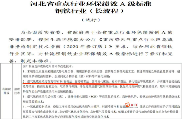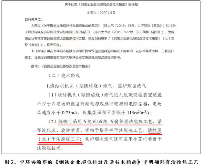 其中最引人注目的是技術路線對照2020年1月中國環境保護產業協會發布的《鋼鐵企業超低排放改造技術指南》,煙氣脫硫技術中取消了活性炭(焦)方法,詳見圖1和圖2對比。