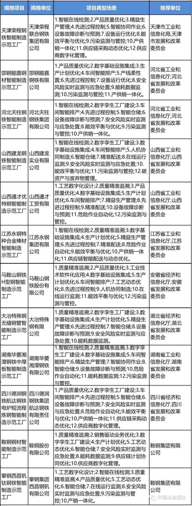 鋼鐵行業入選2023年度智能制造示范工廠單位名單: