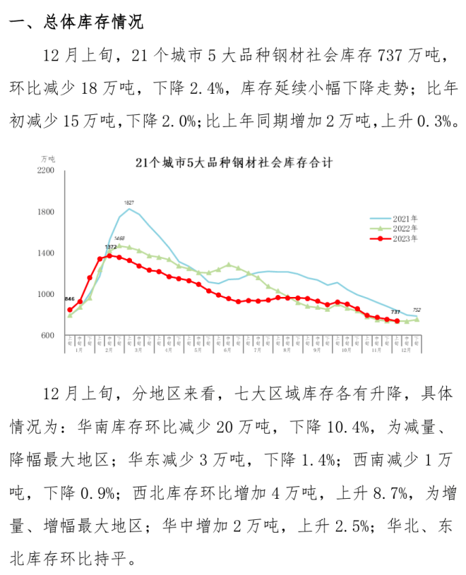 2023年12月上旬鋼材社會庫存737萬噸,環比下降2.4%