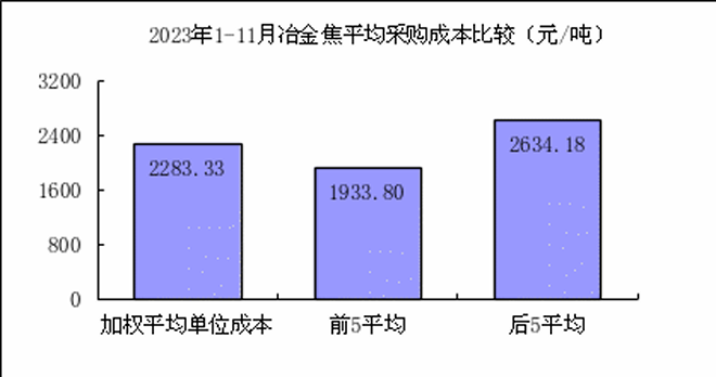 冶金焦11月份加權(quán)平均折算成干基的采購成本2270.28元/噸,環(huán)比升高5.63元/噸,升幅為0.25%。1—11月累計(jì)平均折算成干基的采購成本為2283.33元/噸,同比下降666.30元/噸,降幅為22.59%。