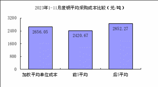 廢鋼11月份加權(quán)平均采購成本為2556.58元/噸,環(huán)比下降10.27元/噸,降幅為0.40%。1—11月累計(jì)平均采購成本為2656.05元/噸,同比下降471.25元/噸,降幅為15.07%。