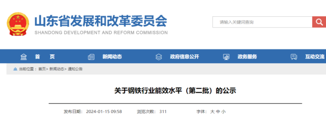 1月15日,山東省發展和改革委員會網站發布了《關于鋼鐵行業能效水平(第二批)的公示》——