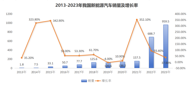 7、據中汽協數據顯示:2023年新能源汽車持續快速增長,新能源汽車產銷分別完成958.7萬輛和949.5萬輛,同比分別增長35.8%和37.9%,市場占有率達到31.6%,高于上年同期5.9個百分點,給電工鋼市場需求帶來了增量空間。不完全統計,2023年新能源汽車消耗高牌號無取向電工鋼100-120萬噸,特別是0.25mm、020mm等以及快速自粘結電工鋼的需求開始增多。下圖可看出,我國10年來新能源汽車銷量及增長率的變化。