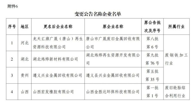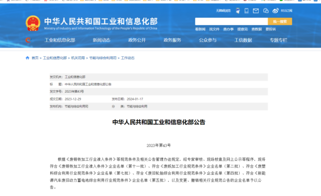 1月17日,工業和信息化部網站發布公告,根據《廢鋼鐵加工行業準入條件》等規范條件及相關公告管理辦法規定,經專家審核、現場核查及網上公示等程序,將符合《廢鋼鐵加工行業準入條件》企業名單(第十一批)、符合《廢紙加工行業規范條件》企業名單(第二批)、符合《廢塑料綜合利用行業規范條件》企業名單(第七批)、符合《廢舊輪胎綜合利用行業規范條件》企業名單(第四批)、符合《新能源汽車廢舊動力蓄電池綜合利用行業規范條件》企業名單(第五批),以及變更、撤銷相關行業規范公告的企業名單予以公告。