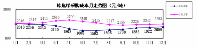 對標企業煉焦煤12月份加權平均折算成干基的采購成本為2009.00元/噸,環比升高87.28元/噸,升幅為4.54%。1—12月累計平均折算成干基的采購成本為1929.13元/噸,同比下降445.06元/噸,降幅為18.75%。