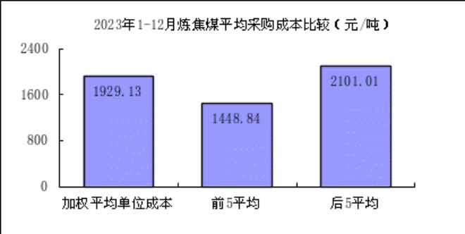 1—12月對標企業煉焦煤平均采購成本最低的前5家企折算成干基的加權平均采購成本為1448.84元/噸,比對標企業平均采購成本低480.29元/噸,低于平均采購成本24.90%;而采購成本最高的5家企業的加權平均采購成本為2101.01元/噸,比對標企業平均采購成本高171.88元/噸,高于平均采購成本8.91%。