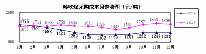 噴吹煤12月份加權平均折算成干基的采購成本為1230.62元/噸,環比下降16.60元/噸,降幅為1.33%。1—12月累計平均折算成干基的采購成本為1321.43元/噸,同比下降354.48元/噸,降幅為21.15%。