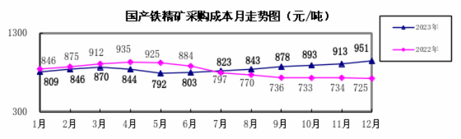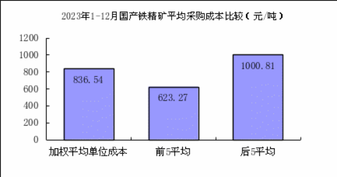 國產鐵精礦(干基)12月份加權平均采購成本為951.35元/噸,環比升高38.60元/噸,升幅為4.23%。1—12月累計平均采購成本為858.80元/噸,同比升高35.96元/噸,升幅為4.37%。