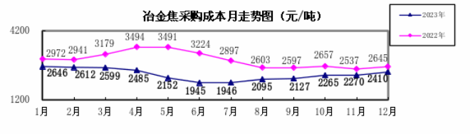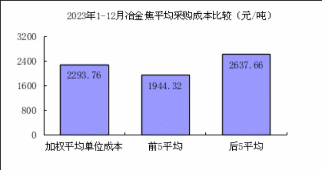 冶金焦12月份加權平均折算成干基的采購成本2409.72元/噸,環比升高139.44元/噸,升幅為6.14%。1—12月累計平均折算成干基的采購成本為2293.76元/噸,同比下降630.81元/噸,降幅為21.57%。